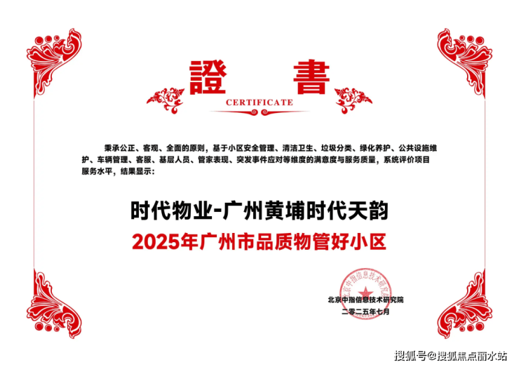 广州黄埔时代天韵以时代物业“初心计划5.0”为核心,借助精细化网格管理模式,不断刷新居住体验,成就城市新生活范本。在7月4日荣获北京中指信息技术研究院评定的“2025 年广州市品质物管好小区”。