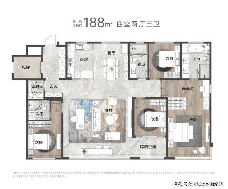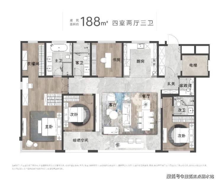 188㎡四室两厅三卫在空间尺度上更显奢阔气场 ,以四南向大面宽重构舒适边界——南向三个卧室,主卧、次卧双套房,让两代人或多孩家庭的居住私密性得到充分尊重。最令人心动的莫过于 10米跑道式阳台,除掉专门的晾晒区,还有6.8米的空间。而主卧的尺度更是堪称 “惊艳”,不仅以独立衣帽间、全明卫浴构建完整的私属生活闭环,更在空间开间与进深上突破常规,每一寸都透着大宅独有的从容与舒展。