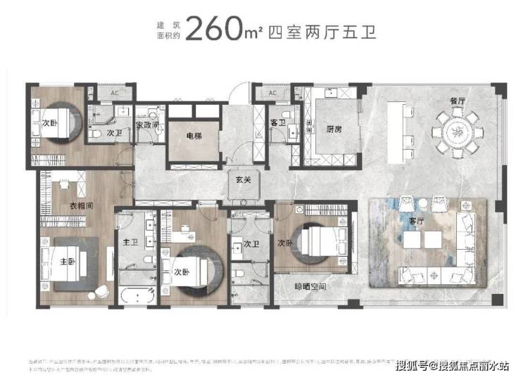 这些年热度颇高的四代宅,与北方气候、生活习惯存在适配性差异,始终未能获得北方购房者的广泛认可。但当设计思路从“错层阳台” 转向“错层挑高客餐厅”,仿佛瞬间打开了新天地——海信金沙滩260㎡大平层, 四室两厅五卫的户型做到了四套房设计,整体面宽24米,有近三分之一的空间做了6.8米挑高客餐厅设计,以立体空间的层次感强化了客餐厅的大尺度和 通透感, 270°的环幕玻璃让这个空间成为能接住第一缕晨光的 “海上会客厅”,尺度之震撼非到现场不足以感受。