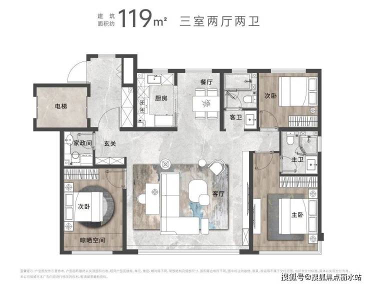 以119㎡三室两厅两卫户型为例,堪称青岛市120㎡左右的户型里的“王炸”产品。宽厅元宝户型 ,南向面宽达到了13.2米,客厅更是达到了6.5米。独立电梯间为全明带上下水及电位设计, 居住私密性和实用性兼具。进门后又有独立家政间设计,进门后的清洁、洗烘需求在此一站式解决,避免生活杂物侵占核心居住空间。玄关凹墙设计能够让大体量柜体隐形,U型厨房和北向餐厅相连,让烹饪、用餐的烟火气集中于一隅,告别空间杂乱。大面宽客厅则得以纯粹聚焦于 “颜值” 与情感交互——家人闲聊、亲友小聚和观景等。另外,三个卧室的尺度均保持舒适得体,南向卧室落地窗设计,主卧配备270°视野、全明卫生间,更是将细节处的品质感拉满。