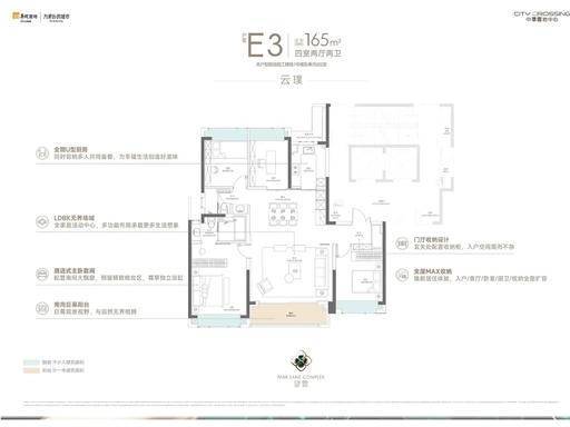 建面约 165㎡四房两厅三卫,为高端改善家庭打造,定位 “公园头排全景舱”,南向无遮挡直面走马塘水系,拥有绝佳景观视野。采用类一梯一户设计,保障居住私密性与专属感;LDKB 一体化 + IMAX 级宽厅创新布局,打造超大公共活动空间,7.2 米南向面宽,让室内采光与视野达到极致;南北通透方正格局,全卧室飘窗设计,带来约 270° 环幕视野,空间感与舒适度双重拉满。三个卫生间设计,主卧配备双台盆独立卫浴,兼顾实用性与品质感,整体户型动静分区、干湿分离,每一处空间都精心规划,既满足大家庭居住需求,又能保障居住品质与私密性。