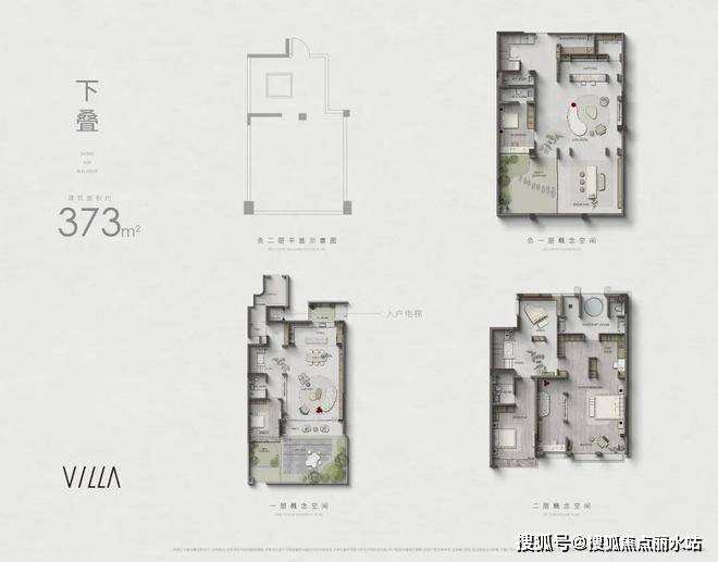 下叠373㎡,总共4层,负二层是独立车库,负一层有挑空庭院,一层是客厅+厨房+卧室,还有入户花园,二层以居住为主