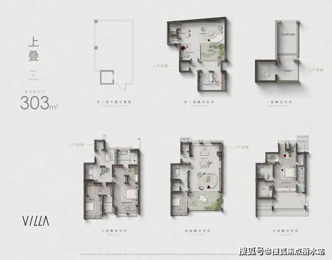 上叠303㎡,共5层实际使用空间,负二层独立车库,负一层挑空庭院,一层入户空间,3-5层为居住使用空间