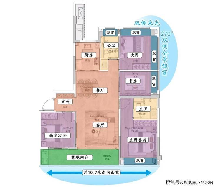 主卧自不必说,单以北侧儿童房为例,有了约270°转角飘窗之后,尺度真是大到惊人的程度。