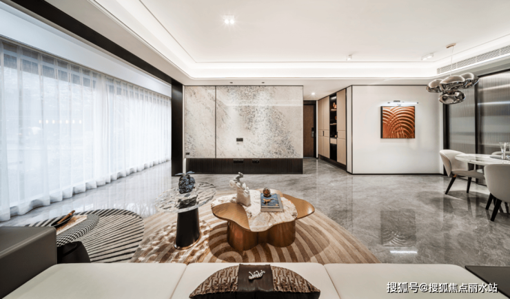 米灰色与黑色金属线条的呼应,不同皮革和岩板的深浅调和,多色彩岩板的多场景搭配,大量弧形吊顶与立体灯光的不计成本运用……