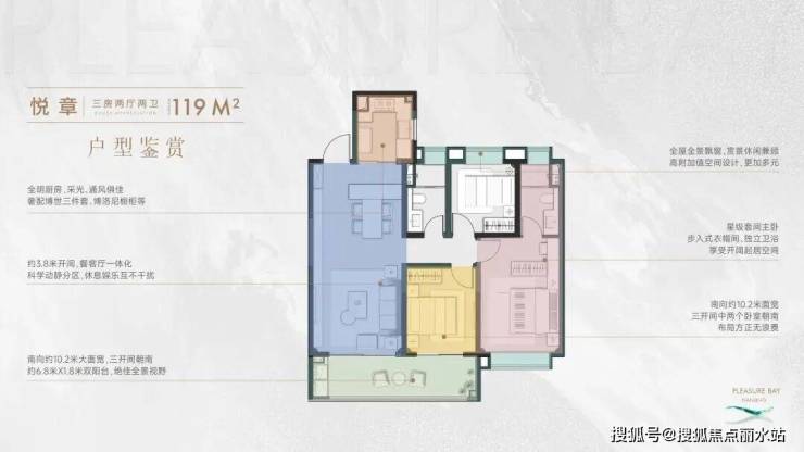 而且,建面约119㎡户型整体格局非常方正,三开间朝南+双阳台设计,南向超10米开间,阳台宽约6.8米,全屋多达4个飘窗,不仅实用性强,还带分户式科技系统,居住尊崇感满分!