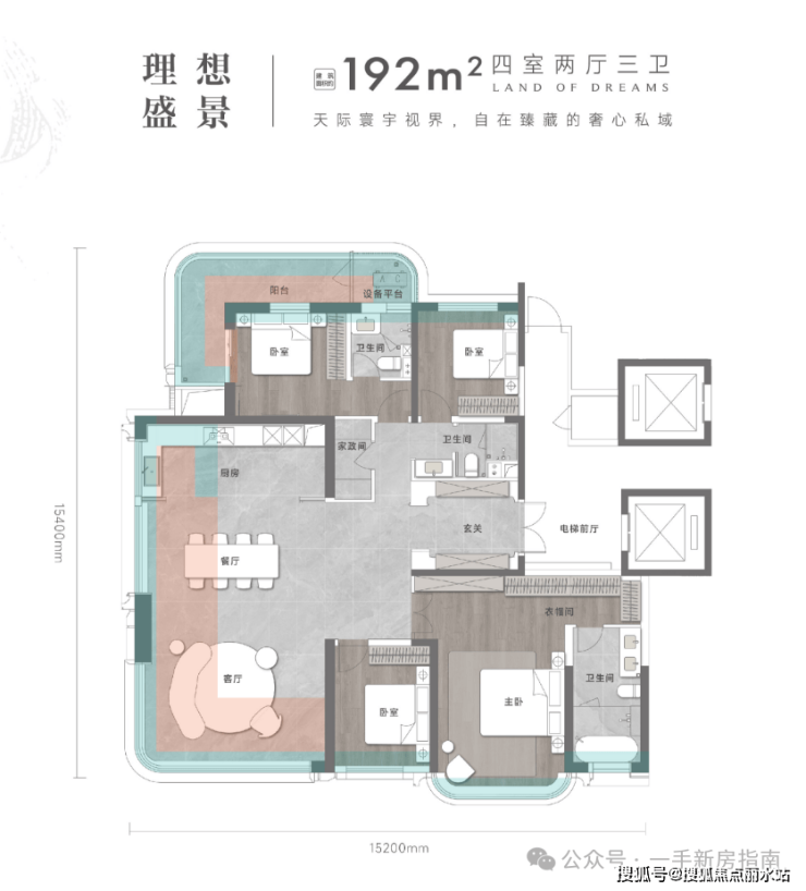 豪宅标配独立玄关,LDKB一体化+270°端厅将景观视野和尺度享受拉到满格,南北双豪华套房既保障了两代人的居住独立,公区又承托住家人间的情感交流,是终极改善的理想型。