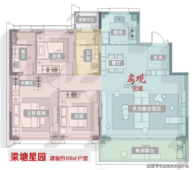 建面约128㎡三房两厅两卫:该户型采用LDKB一体化设计,让整个室内空间采光更通透同时,形成巨大的互动空间。