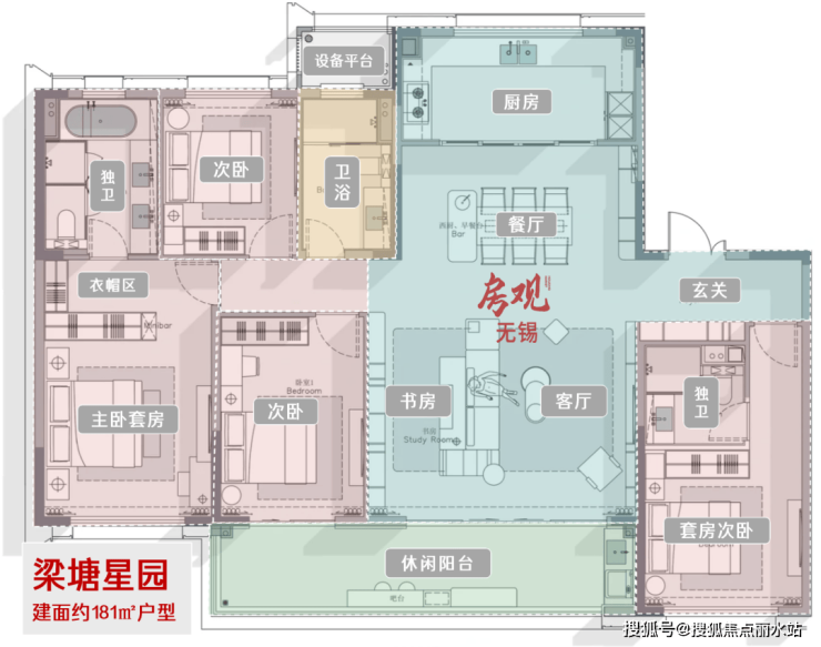 建面约181㎡四房两厅三卫:五开间朝南+LDKB一体化设计,让客厅、餐厅、厨房与阳台完全贯通,空间通透感与互动性拉满,将大平层的空间感带到了洋房;