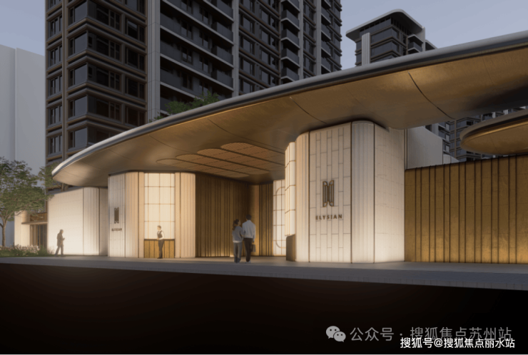蓝灰色玻璃+仿石铝板+艺术涂料材质,穿插优雅线条,让建筑这张“脸”看起来更高级。One&Only酒店式门头。用雕塑体块、温润弧面和雅致线条,营造具有艺术格调的归家仪式感。