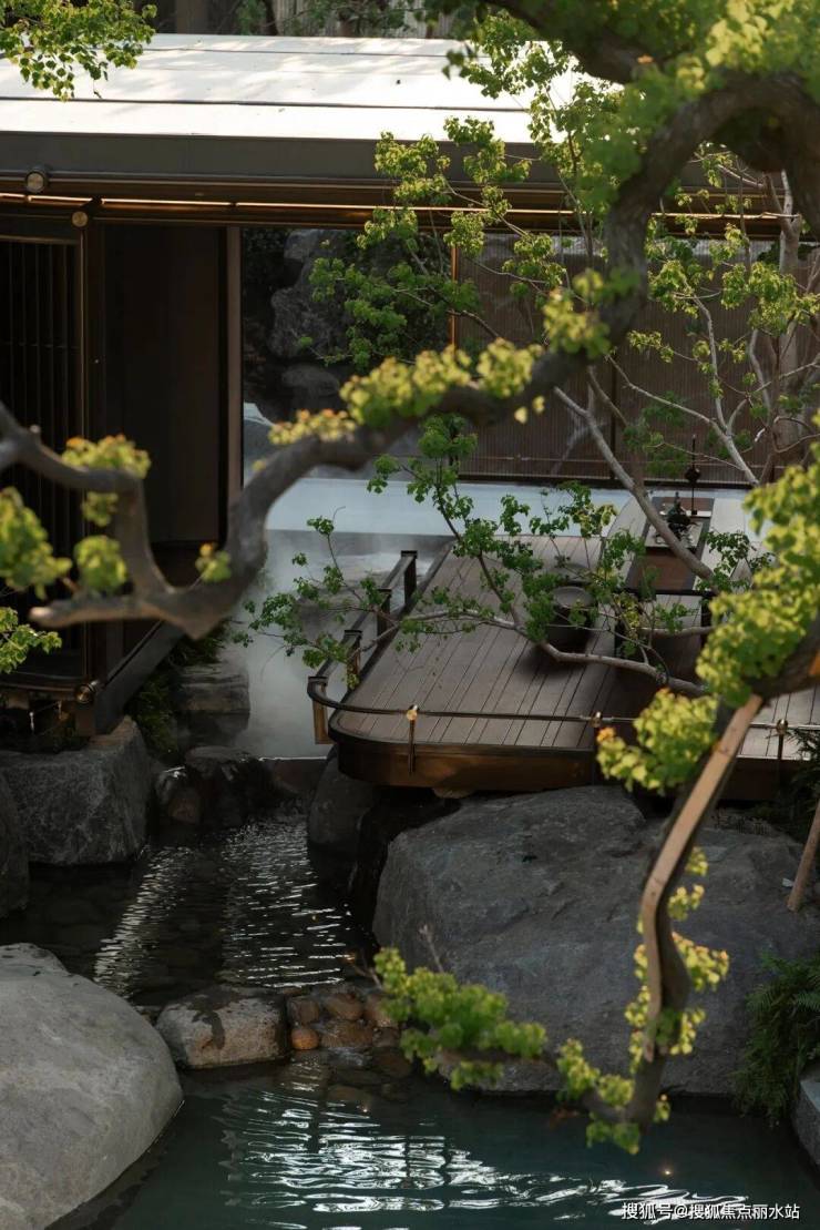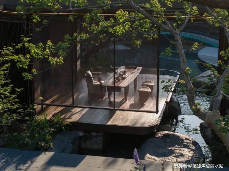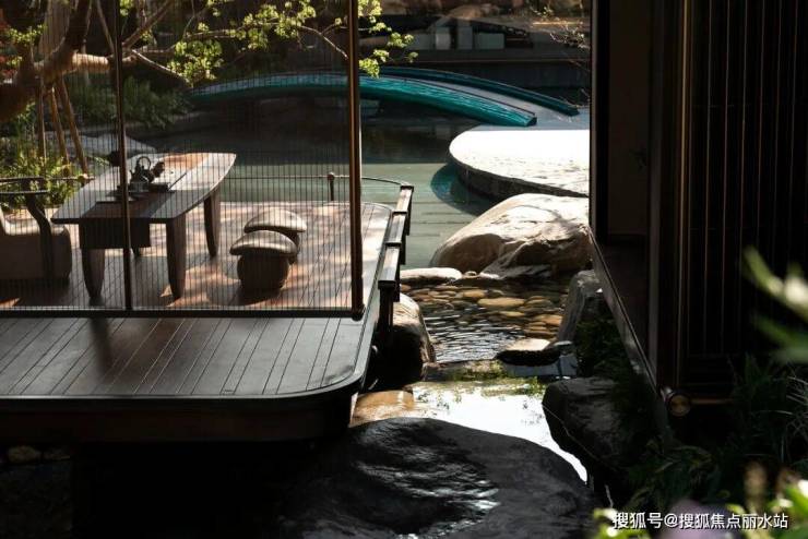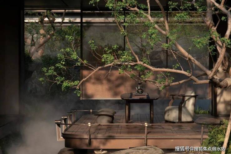 置一茶轩悬浮于石溪之上,水从底部石上流出,深郁的山坳间腾起云雾,弥漫浮动,吞吐变灭。山石自然参差,有沟涧、宽溪、石隙,水在其间流淌、跌落,激荡自然而然的山水清音。山苍树秀,水活石润,青山自青山,白云自白云,世事流淌人在其间,纷扰的尘嚣远去,喧嚣的声音荡尽,回归最原始的静寂的天地。