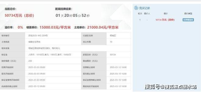绿城宸庐,即苏地2025-WG-Z04号地块,位于相城区高铁新城民乐路东、陶村街北,是2025年3月12日,苏州宏腾&江苏汇欣鑫以5.53亿的总价竞得,成交楼面价15828元/平,溢价率5.52%。