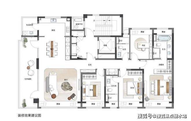 主卧套房,双衣帽间,三面采光;南向双开间阳台;双套房次卧;