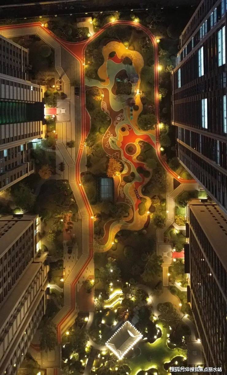 NO.3 儿童游乐区因地面颜色和图案,在灯光曾托下有彩绘效果,如未来小朋友在玩,动静结合夜景效果会不错。但儿童游乐区缺少绿植、缺少游乐设备,因此夜景效果好看之余可能又会比较单调。