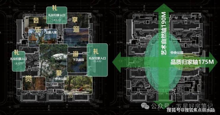 项目园林景观以自然为基底,精奢艺术为腔调,精心打造两轴、多园、七庭结构,以归家动线划分景观空间,多功能中央公园自然绿肺,七大主题庭院承载不同度假感氛围,深化“礼、乐、品、赏、游、聚、遛”人居景观体验。