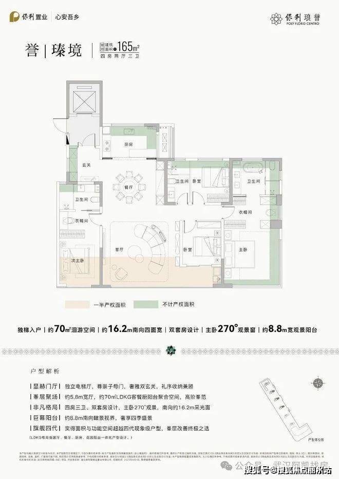 165㎡户型:四房两厅三卫,该户型为四房三卫,独立电梯厅,双玄关入户,约16.2米南向四面宽,约8.8米的南向宽景阳台,有70㎡的动区空间,双套房设计南,主卧为270°观景窗设计。保利琅誉售楼处电话400-8838-165