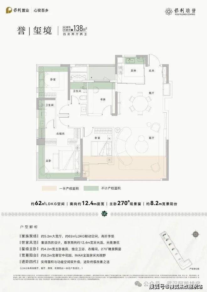 138㎡户型:四房两厅两卫,该户型为四房两卫,三开间朝南,入户玄关,南向面宽约12.4米,约8.2米的南向宽景阳台,完全动静分区设计,有62㎡的动区空间,双卧朝南,主卧为270°观景窗设计。