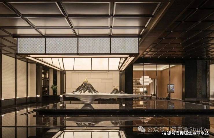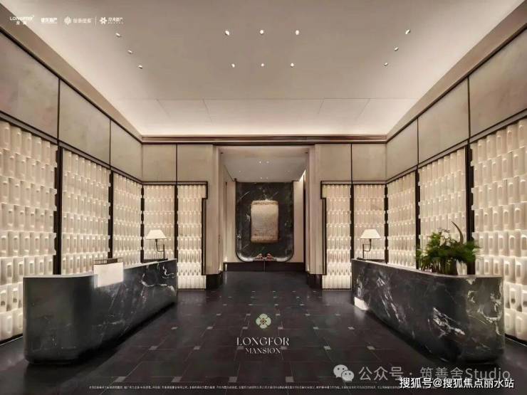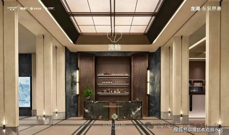 大门采用罕见非遗工艺精心打造,通高5.5米、宽3.6米,以2.4吨黄铜铸就而成。门上“水纹”由苏派匠人手工锻打8万次,形似史卷铺展,触感温润。香槟金方格吊顶与悬浮云石相映成趣,刚柔相济,宛如诗句对仗,意境深远。