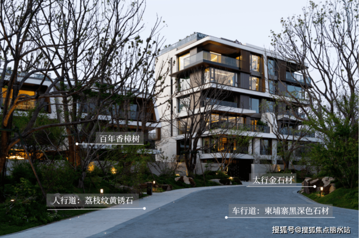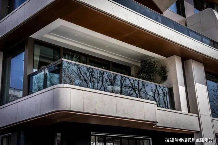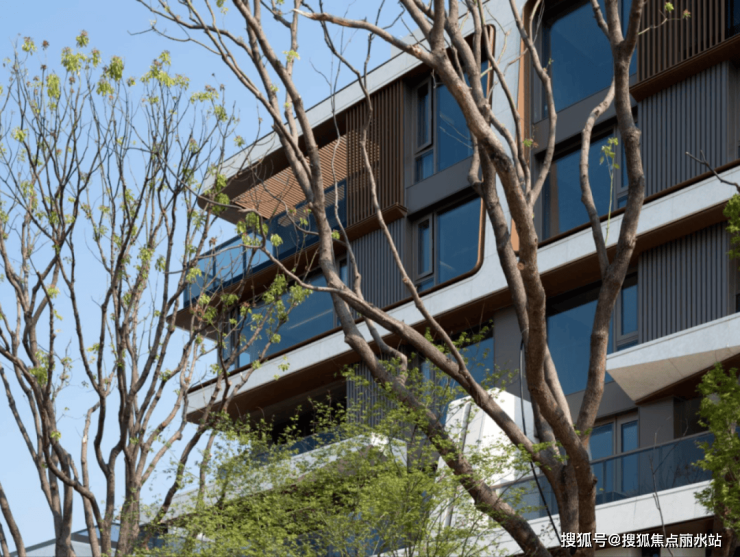 层层退台使建筑形态如船体般轻盈灵动,不仅呼应了紫琅湖水岸线,更创造了 “犹抱琵琶半遮面” 的视觉层次——从香樟林径望去,建筑与树林形成相拥相守的关系,形成与湖面、天空的动态呼应。外立面选取沉香米黄石材与安哥拉黑棕石材色彩搭配,融合咖色铝板与玻璃幕墙的现代笔触,仿佛从湖畔土地中自然生长而出,更让建筑成为自然肌理的延伸。