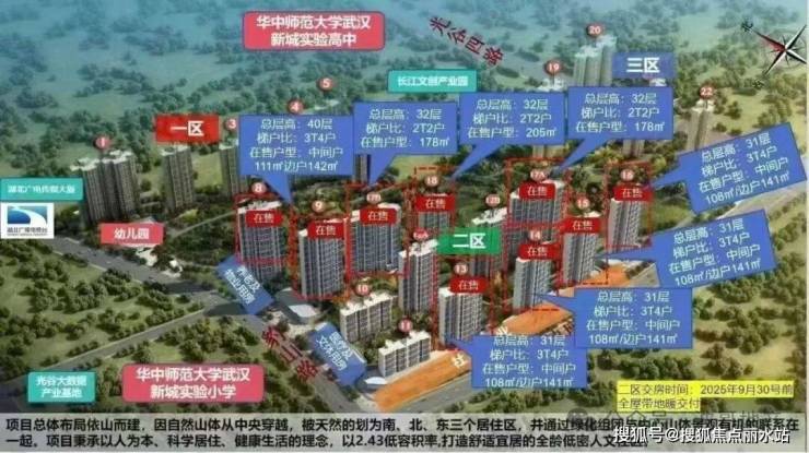 项目开发总占地约164191.31㎡,建面约600210㎡,容积率约2.43,总户数约2797户,绿化率30%,机动车位共4769 个,其中一区1089个,二区2550个,物业费2.8元/m²/月。 项目总共23栋楼,16层-41层高层及超高层产品,2梯2户、2梯四户、3梯四户布局;前期一区、三区已交付,二区预计在2025年9月30日前交付,整个二区全屋采暖交付(除厨房和阳台)。