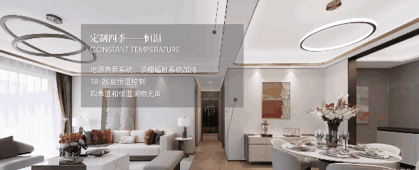 樾湖尚郡采用天棚辐射、地源热泵、屋顶地面保温系统等,不用空调/地暖将日常温差调节到最小,可以让室内温度保持在18-26℃区间,无吹风、无噪音。
