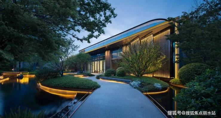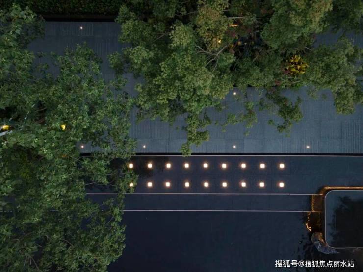 城市的喧嚣在这一隅园林中被沉淀,天色低垂,一池澄澈水面映衬着水乡的灯火通明,设计将夜幕中的灯火点缀在景池中,如江南繁华初绽,繁星摇曳。
