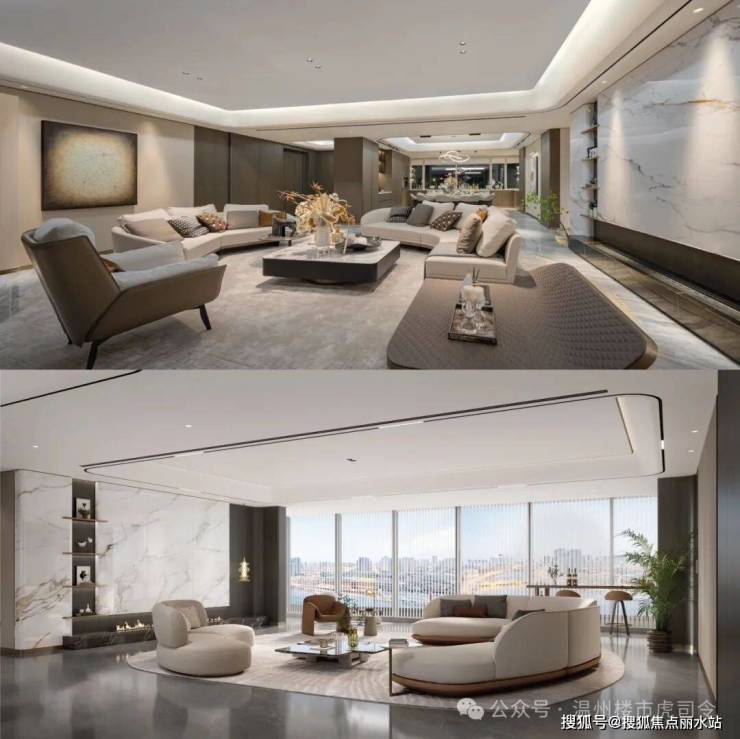 3.IMAX超大会客厅| 约8.4m面宽的大客厅,连接约11.9m转角圆弧形阳台,透过落地窗能俯瞰超万方中庭景观,尽显豪宅生活风光