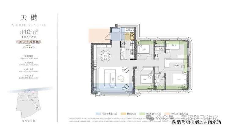②140㎡户型:四房两厅两卫,该户型南北通透、三开间朝南;因为3号楼的楼栋朝向、位置,属于北向看江,因此,这一户型的北面房间——次卧、儿童房拥有还不错的看江视野(中高楼层以上房源)。客厅空间相当的开阔,动静分区做的也比较好。售楼处电话400-8787-098接通后输入5678【营销中心】