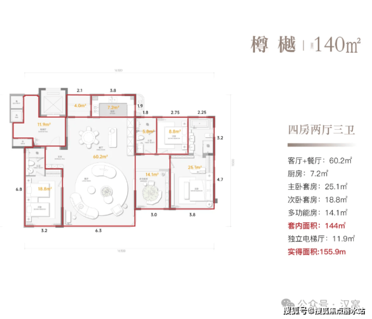 建面约119平,实得面积约127平,得房率约106%。南北通透三面采光的边户,独立电梯入户,同样也有独立电梯前室可以利用。