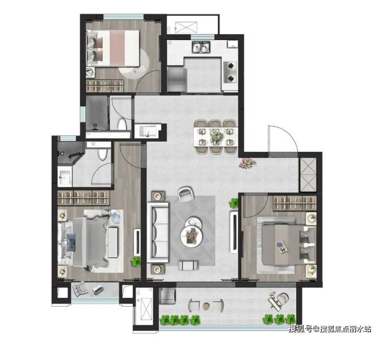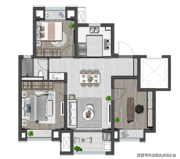灵动三房,随年轻家庭需求百变;入户玄关设计、餐厨一体化、全卧室飘窗设计,充分利用室内空间。