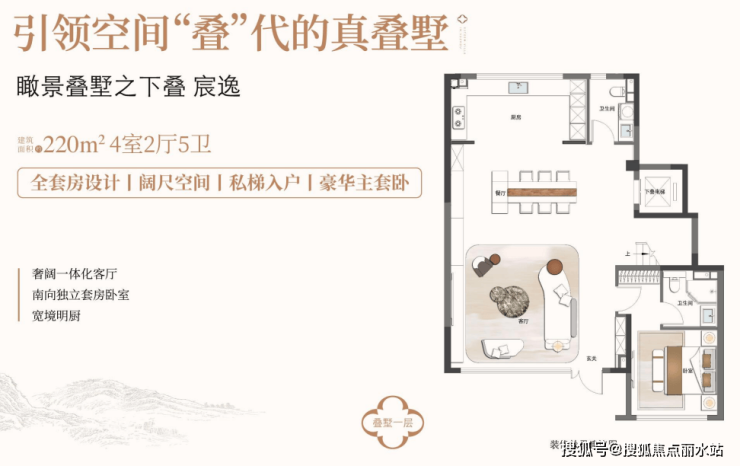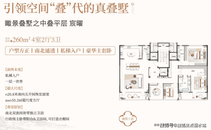 在这里我们要强调下它的平墅户型:该产品融合了平层尺度与别墅功能,约20.8米南向五开间,超大尺度方厅达到约55.2㎡,私梯入户,“一层一世界”,南北双套房设计,不仅确保了每代人之间的居住独立性与隐私,更让每一位家人都能享有套间级的舒适与尊崇体验。