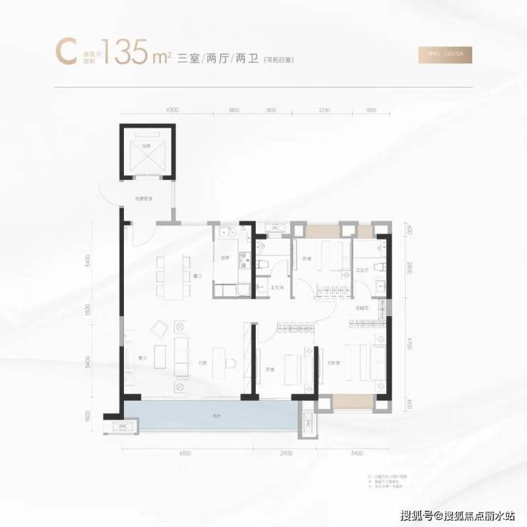 是个尺度奢阔,“成长性”极强的产品。电梯入户,“独享”约5㎡的电梯前室空间。餐客厅与阳台贯通,豪华大横厅的气场拉满。
