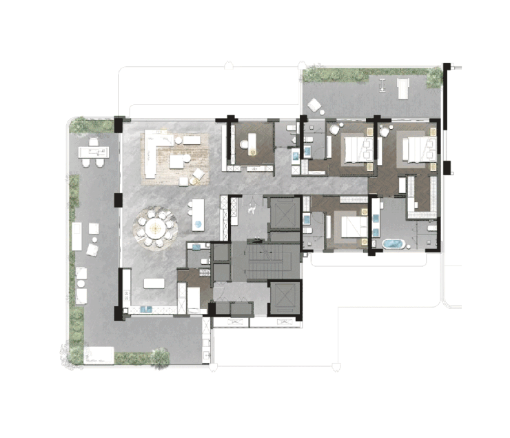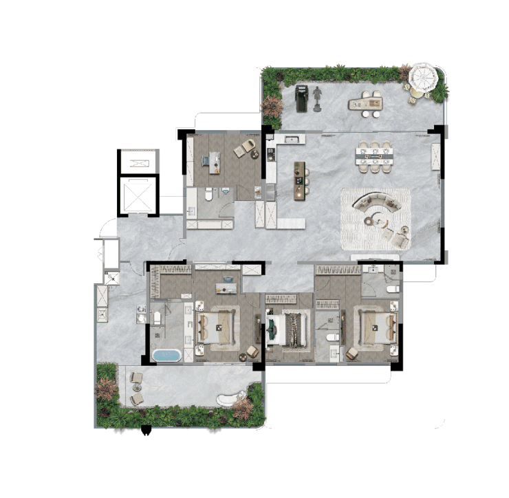 项目打造立体花园,创新户型设计,将客厅、卧室与空中花园融为一体,颠覆了传统室内外空间的界限。充分利用立体生态住宅的空中花园优势,通过超大面宽、自由舒展的设计,拓宽观景视野,增强内外空间的连贯性。让住户在全新维度中,尽享亲近自然、感受大自然的美好。
