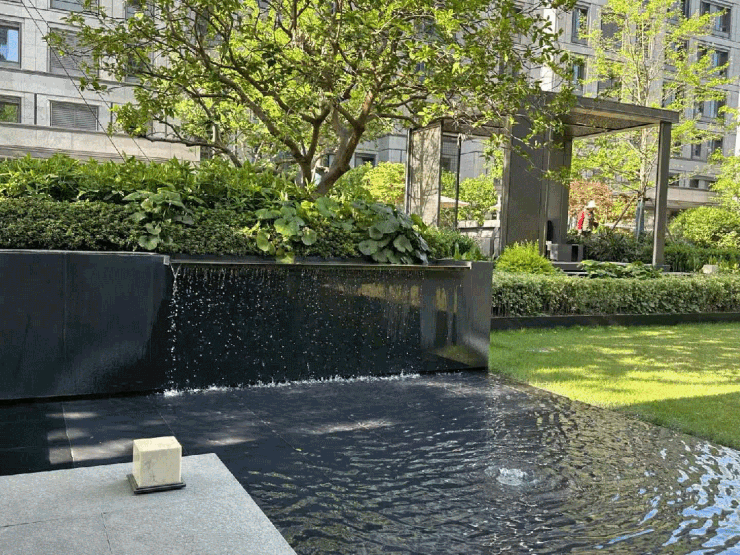 新睿樾府,运用浅色系石材,搭配大面水景、草坪,配以景亭、全冠乔木、可以随意聊天social的休憩小品,还原阿那亚式度假的松弛、马尔代夫白马庄园般的惬意。