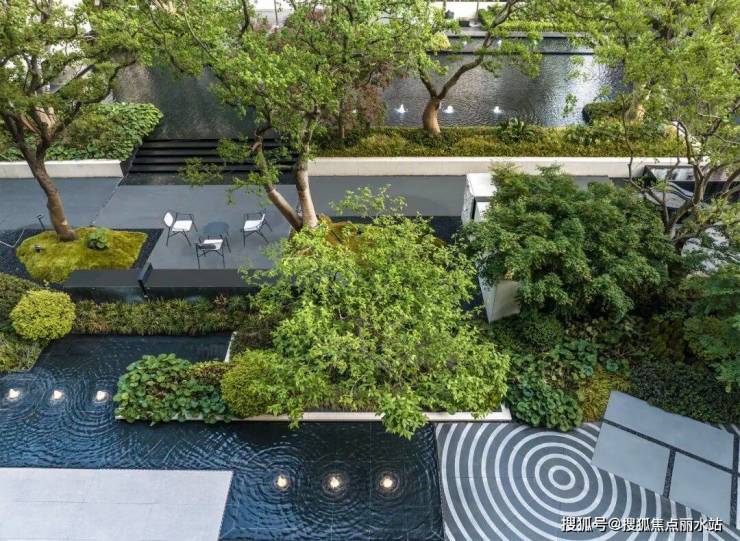 新睿樾府打破架空层与景观的界限,让它们成为彼此眼中的风景。小尺度空间-宅间花园表现亦不遑多让,登高面局部运用“水波纹”异形石材,野奢气息弥漫。