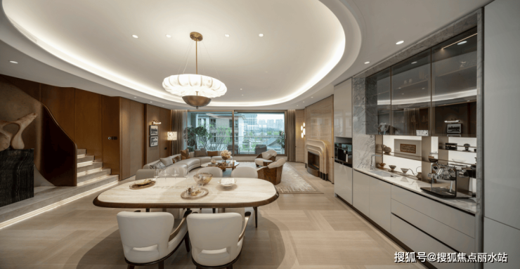 一层为客餐厅和一个带独立卫生间的套房,层高约3.4米非常舒适,客餐厅为L型的大面落地玻璃,妈妈端着菜放到餐桌上的时候,就能看到孩子在室外玩耍。