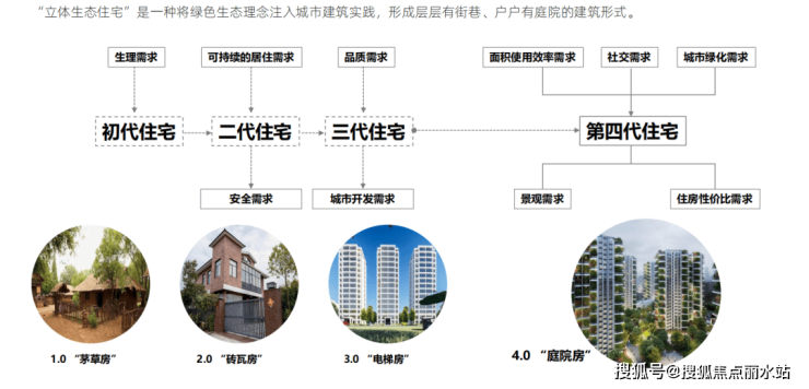 全球居住方式的演变就像历史的一面镜子,从一代原始茅草房、二代砖瓦房再到三代电梯商品房,为适应社会发展而不断探索创新与迭代演化。在当今城市现代化的时代背景下,“钢筋水泥式”、“封闭式”的空间环境让居住体验大打折扣,生态扩容的呼声日渐高涨。如何在高密度的城市背景之中,平衡全人类、城市与自然之间的关系,成为人类共同体亟需解决的问题。由此, 第四代生态住宅应运而生。