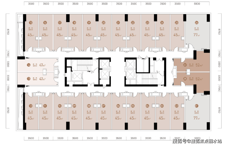 悦玺的主力户型为建面约45㎡,面宽约3.5米。