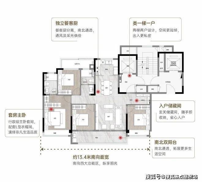 建面约129㎡户型,四大核心优势:稀缺类1T1户设计,私密入户体验;独立储藏间,收纳有序;约13.4米南向大面宽,明阔日常;LDKB设计,场景联通,多变生活;更有灵动X空间,定制不同家庭的改善所需。