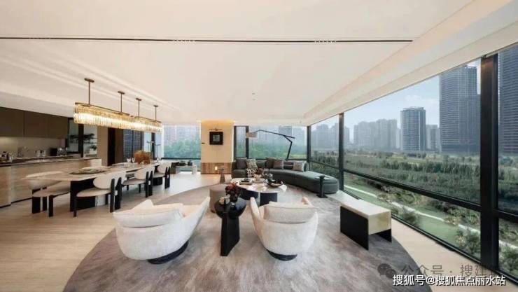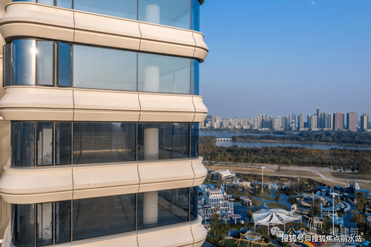 约40㎡、270°环幕视野全景舱,窗外直面沙河头排景观,如同身处IMAX巨幕厅。全景舱难免出现的转角处承重柱,也被澳南·锦江序巧妙避开。为还原全景舱视野,项目使用了约5000块曲面铝扣板材和大面积转角弧形玻璃,真正比肩超级豪宅。