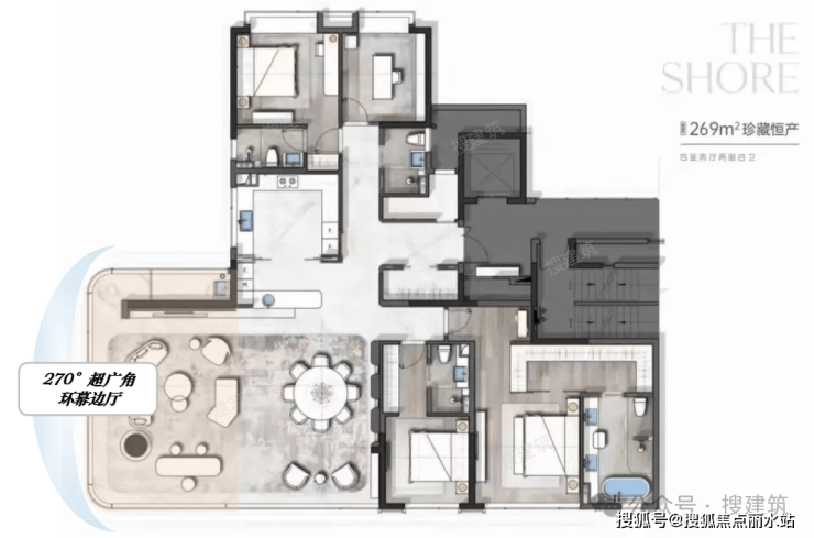基于湖景朝向,户型面积约269㎡,拥有270°景观视野的端厅,将最大程度享受外部资源。