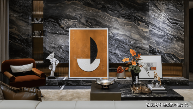 严选世界尊奢材质:威尼斯棕奢石电视背景墙、威尼斯棕岩板洗手台等。