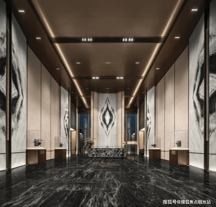 大堂重要位置,还打造了一面由巴西天然奢石熊猫白铸就的背景墙,可以说非常震撼。