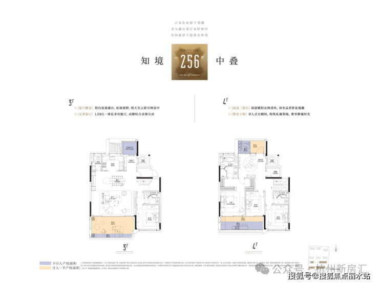 跟以往传统中叠类似于洋房跃层不同的是,潮语臻境府中叠做了类四代宅的处理。比如层高达到约3.4米,阳台延伸成一个大进深、建面约24㎡的露台,更像是一个空中庭院。而且两层空间都有南北双阳台(露台)。