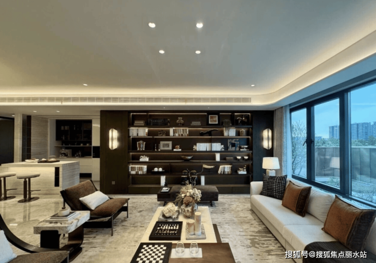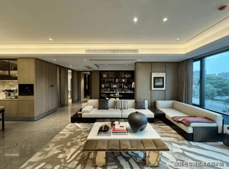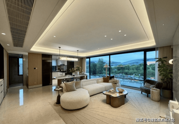 无界方厅:LDK一体化寰幕社交方厅,连接约6.9米大尺度阳台,宴客、静思、赏景自由转场;