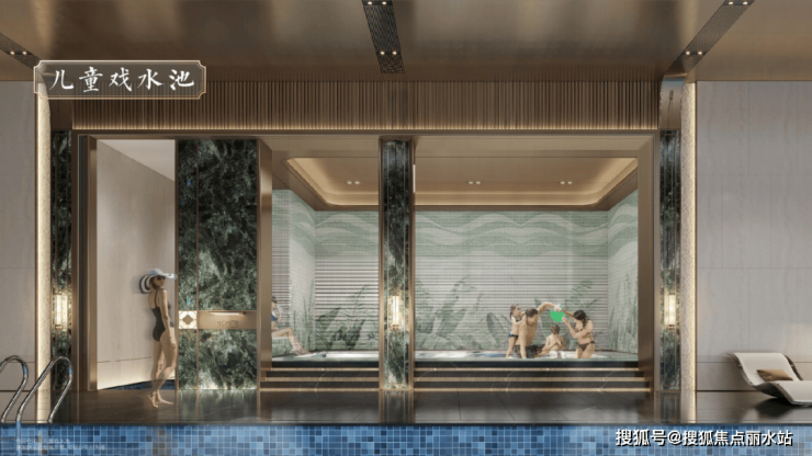④地下恒温泳池:配置了成人标准的泳池(约25*7米),并且单独设置了儿童的戏水空间,健身器材,满足不同年龄层次的需求。设置前台接待大厅,搭配蓝翡翠奢石吧台