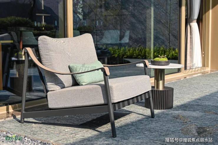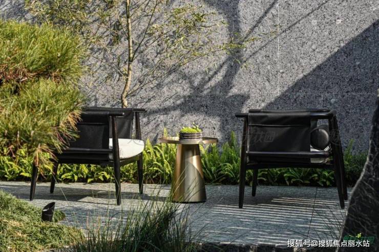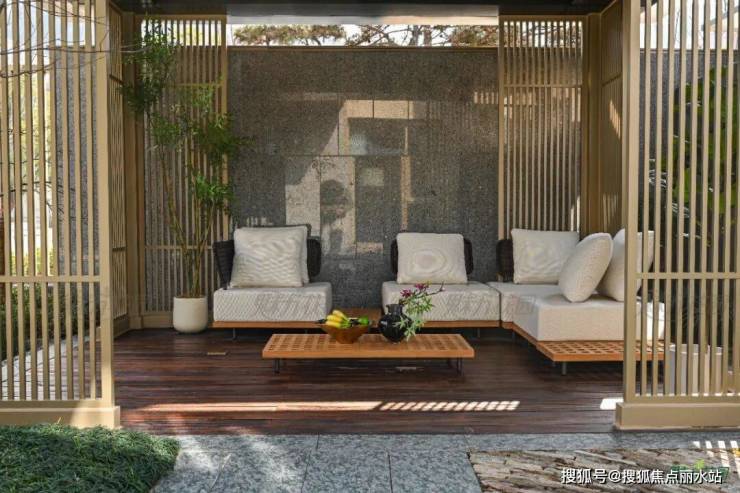 金属格栅圈围出一片静谧天地,木质地板承载着慵懒时光。一旁池塘倒映着草木风姿,点缀出勃勃生机,阳光洒落此间,说不出的自在惬意。