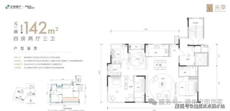 该户型大开间、短进深,居住舒适度非常高;建面约142平四房设计,还带三个卫生间,功能性强;该产品可以作为终极改善置业,设计的也非常好。