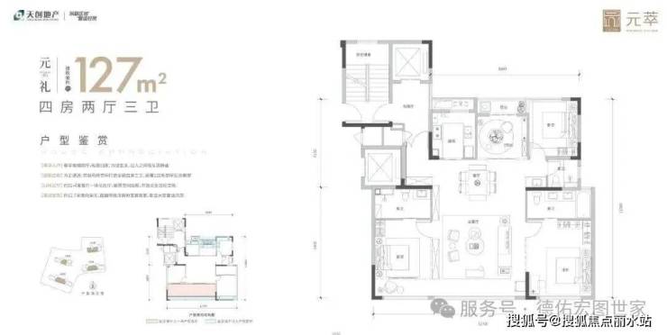 建面约127平不仅做到了四房设计,还有三个卫生间,功能性更强,不过动静分区相对较弱。