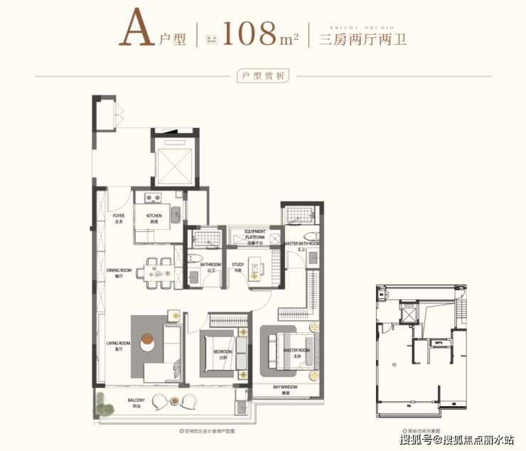 其中建面约108㎡户型,三开间朝南,给人一种大三房的视觉感,独特之处在于: